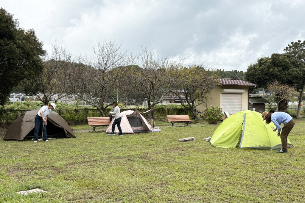 女性エリアから微妙に視線を逸らしてのテント設営、感謝です。