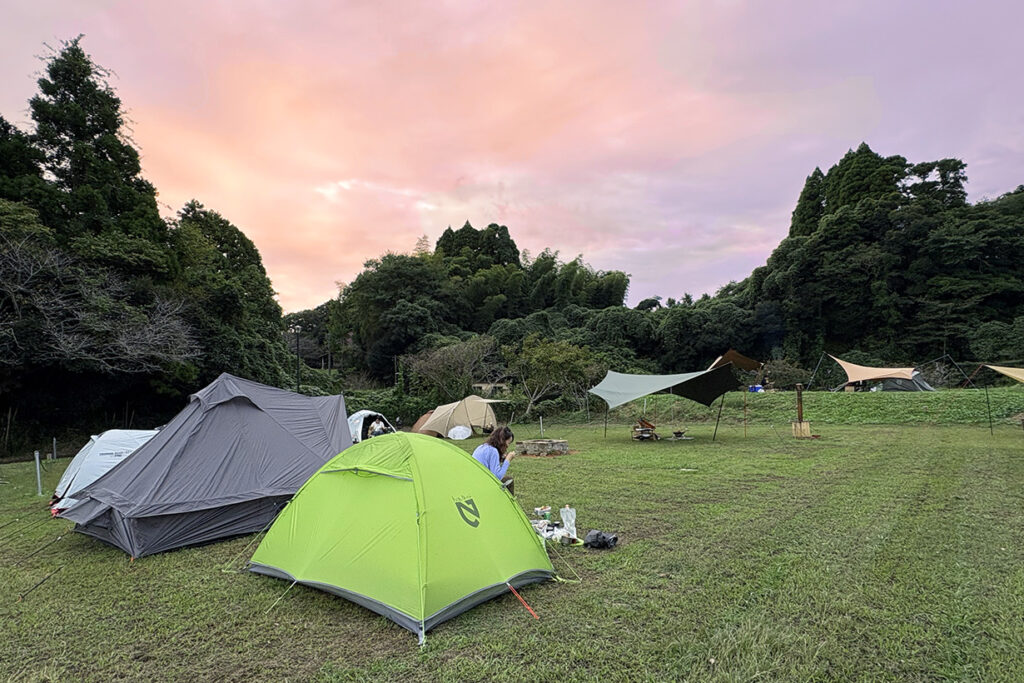 空は美しい夕焼け色に染まります。キャンプ飯を作る人、早速缶チューハイを開ける人も。