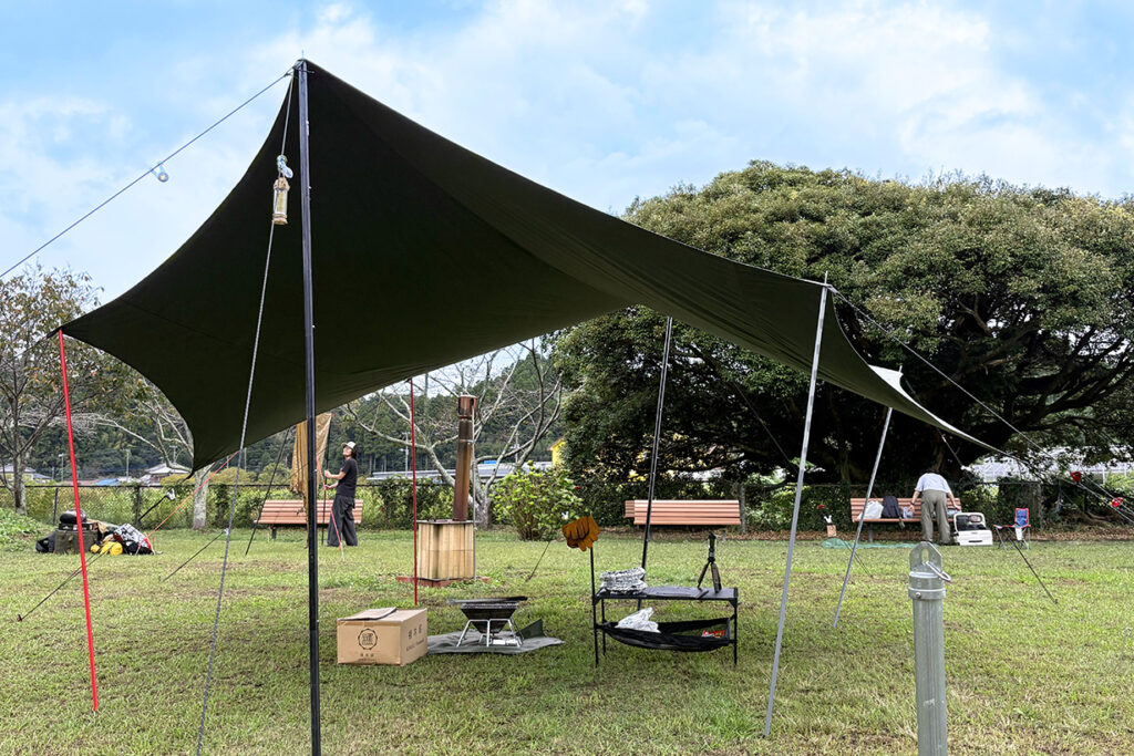 まずは貸切エリアの中心にリビングタープを設営しました。