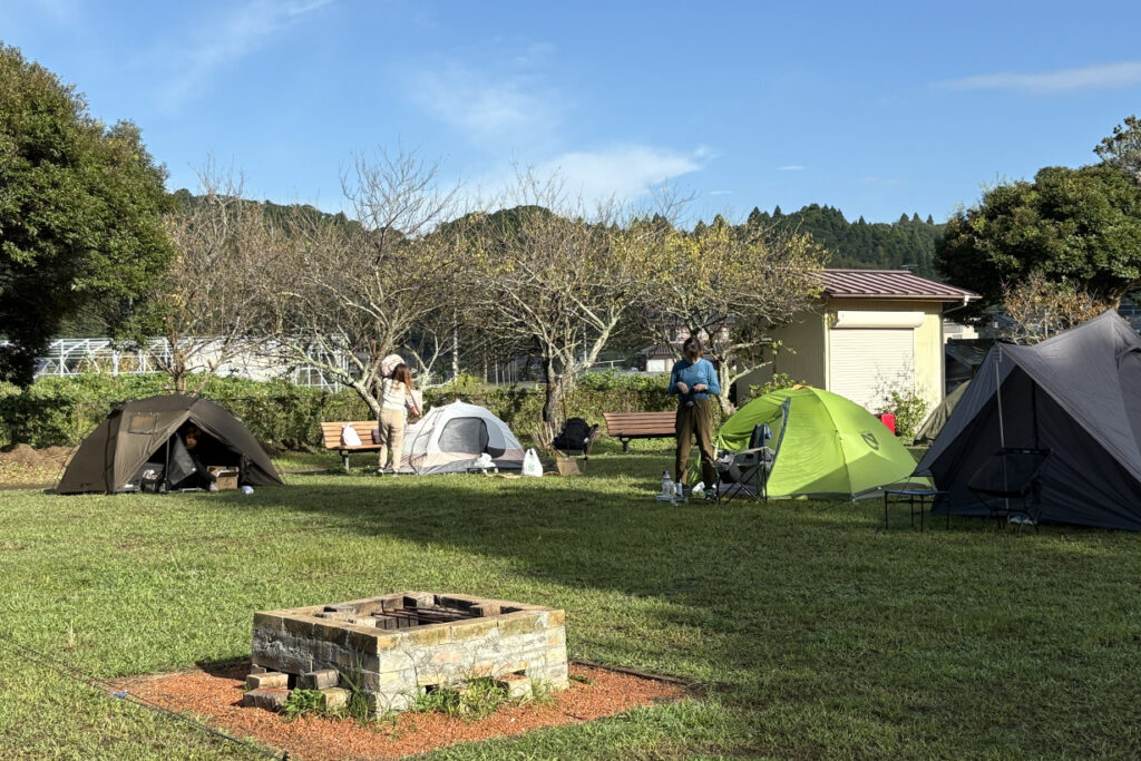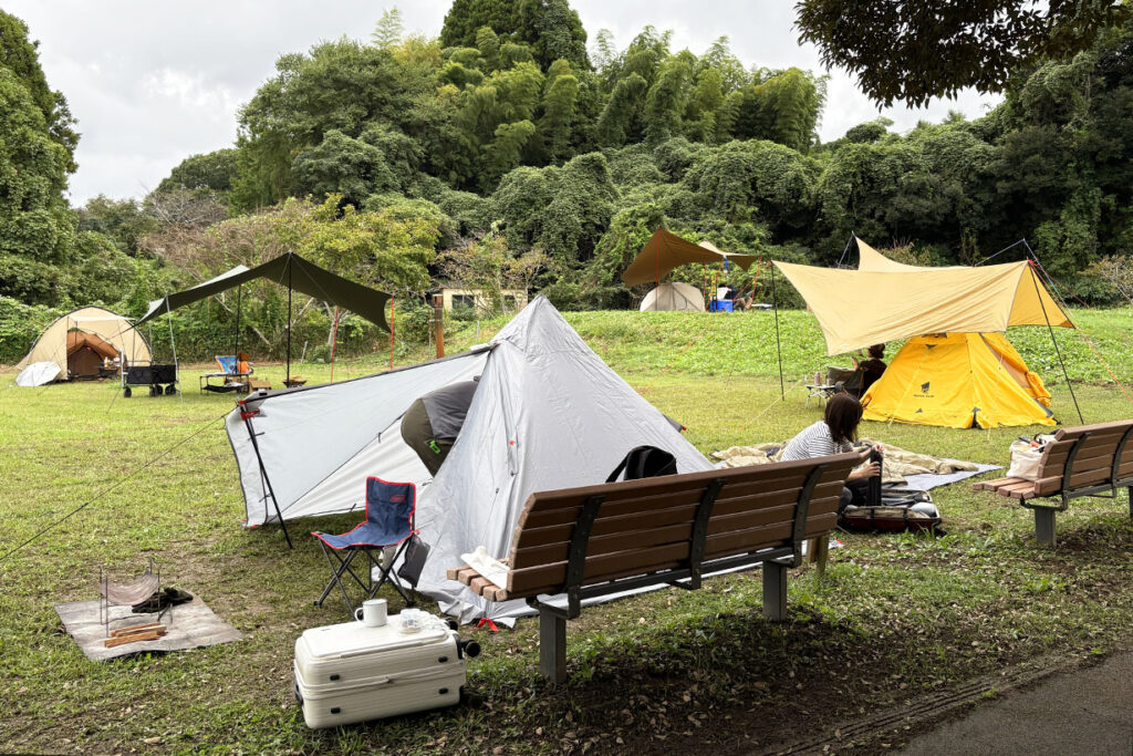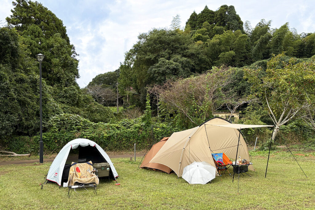 ひと足お先に設営! 座長・徒歩キャンパー春菊と、クルマに便乗させてくださった、Fさんのテント。