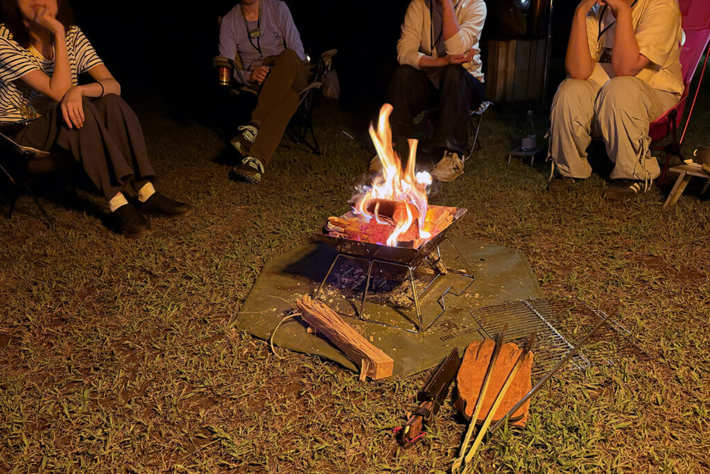 焚き火を囲んであれこれ女子トーク。「カーシェアの予約が大変で」「そうそう!」